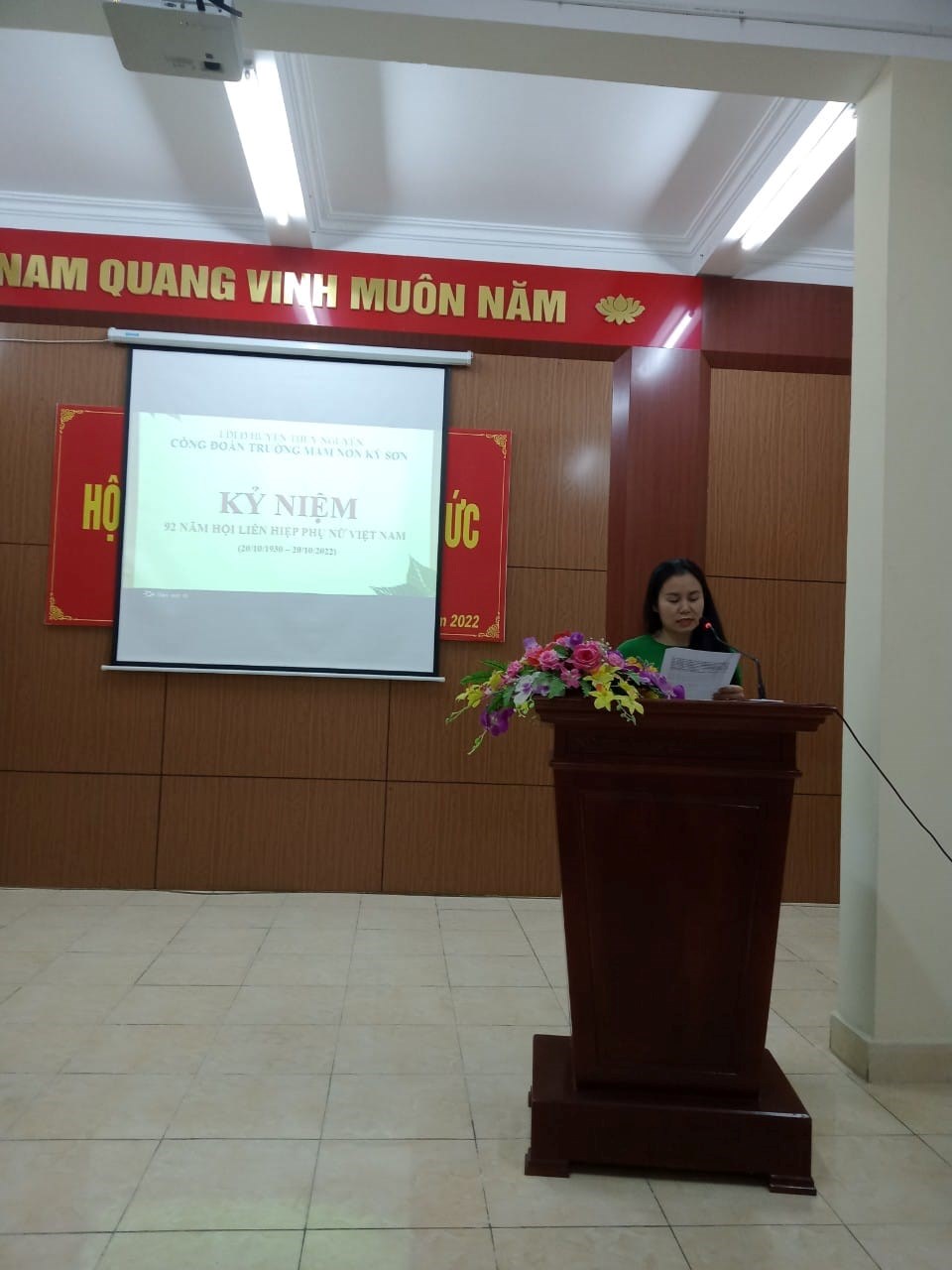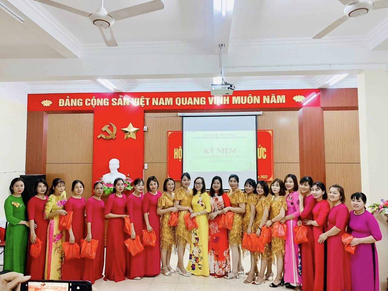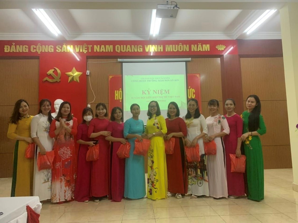 Trong không khí thi đua chào mừng ngày 20 tháng 10, kỷ niệm 92 năm ngày thành lập Hội lên hiệp Phụ nữ Việt Nam. Hòa chung cùng với niềm vui, niềm phấn khởi, tự hào của các tầng lớp phụ nữ. Ngày 20/10/2022, Công đoàn trường Mầm non Kỳ Sơn tổ chức Lễ kỷ niệm 92 năm ngày thành lập Hội Liên hiệp phụ nữ Việt Nam (20/10/1930 - 20/10/2022) và tặng quà chia tay giáo viên Đỗ Ngọc Thùy Linh chuyển công tác.